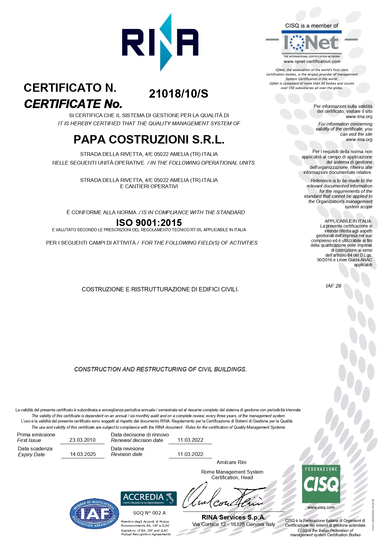 Nel 2010 l’ impresa ottiene la certificazione di qualità secondo norma ISO 9001/2008 oggi evolutasi in ISO 9001/2015 e attestazione SOA per categorie OG1 class. IV bis e OG 2 class. I.